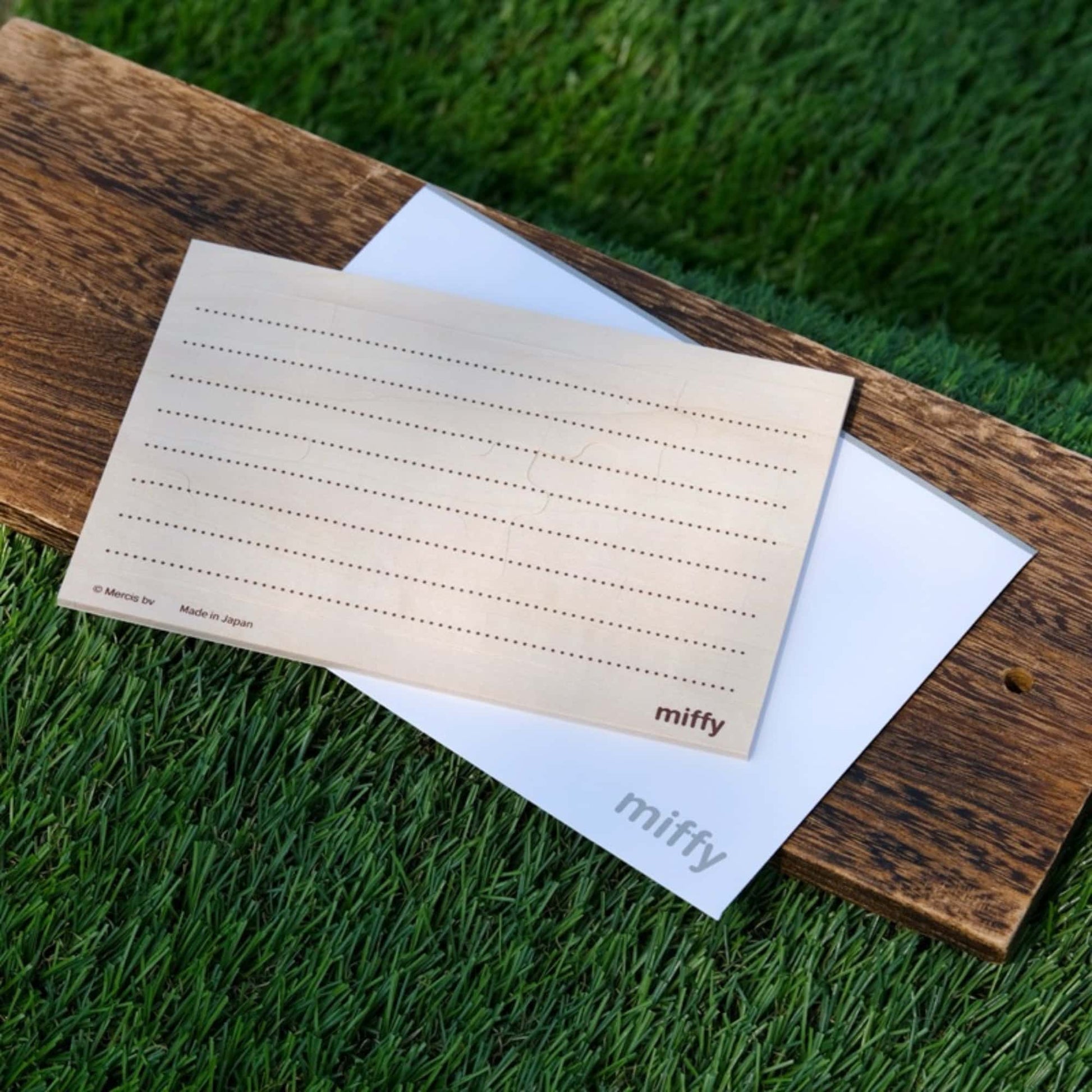 At first glance. it looks like a wooden postcard. In fact. this is a unique letter kit in which the card surface is a jigsaw puzzle. The front side features a vivid. colorful illustration of Miffy. The back side is free space where you can write your message. Once you've finished writing. disassemble the puzzle and put the pieces and frame into an envelope. The recipient of the letter cannot read the text unless they solve the puzzle. which is a fun idea. Of course. you can also send it as a card and enjoy the puzzle after reading it. It's an item that can be used in a variety of ways.